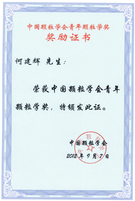 Dr. Junhui Ho was awarded the Young Scientist Award In Particuology by Chinese Society of Particuology in 2012