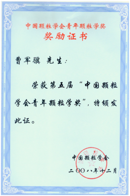 Dr. Junji Cao was awarded the Young Scientist Award In Particuology by Chinese Society of Particuology in 2008